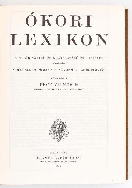 Ókori lexikon I-II. kötet. Szerk. dr. Pecz Vilmos.Bp., 1902-1904, Franklin-társulat. II. kötet reprint, 1985, Könyvértékesítő Vállalat. I. kötet: átkötött keménykötés; II. kötet: egészvászon-kötés.