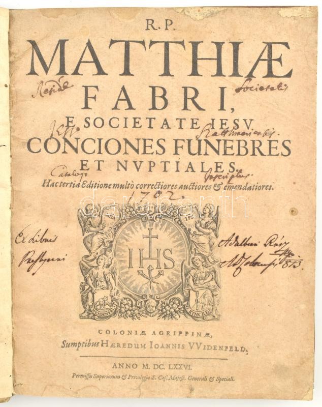 Matthiae Fabri: E societate iesv. Conciones funebres et nuptiales. (Köln) Coloniae Agrippina, 1676, Johann Widenfeldts. 63+1 p, 93+1p. Sérült karton gerinccel, korabeli kartonált papÃrkötés, régi kódexlapba kötve.