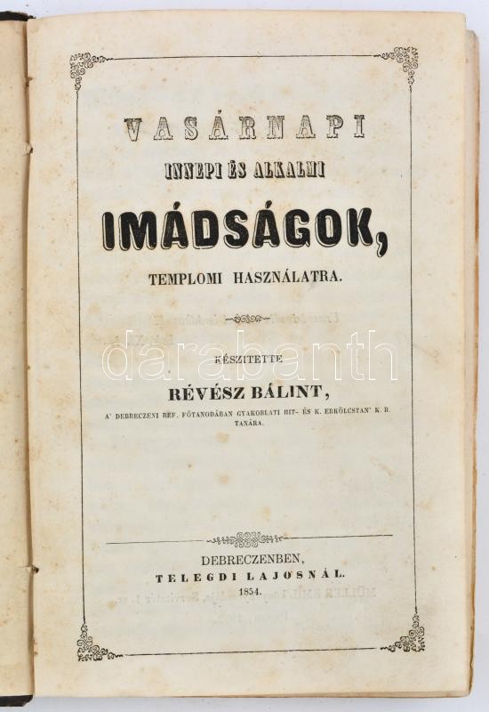 Révész Bálint: Vasárnapi, innepi és alkalmi imádságok, templomi használatra. Debrecen, 1854, Telegdi Lajos,(Pest, Müller Emil-ny.), 8+376+4 p. Második kiadás Félvászon-kötésben, kopott borítóval, hiányos gerinccel, kissé dohos, egy-két lapon egy-egy szavas bejegyzéssel.