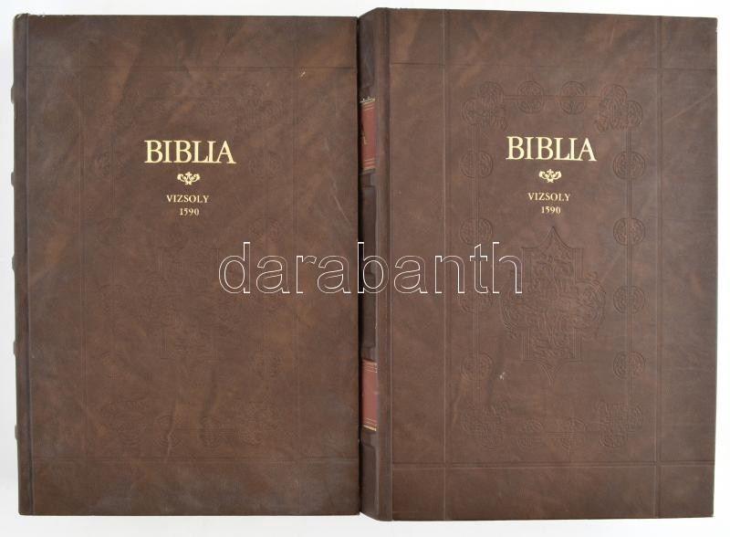 Vizsolyi Biblia. I-II. köt. Bp., 1981, Helikon Kiadó, (Kner Nyomda.) Kiadói aranyozott, bordázott gerincű, dombornyomott műbőr kötés, kísérőfüzettel, (Szántó Tibor: Károlyi Gáspár Vizsolyi Bibliája. Bp., 1981, Helikon. Kiadói papírkötés.) Facsimile kiadás. Kiadói kartontok nélkül, egészen apró kopásnyomokkal, de alapvetően jó állapotban.