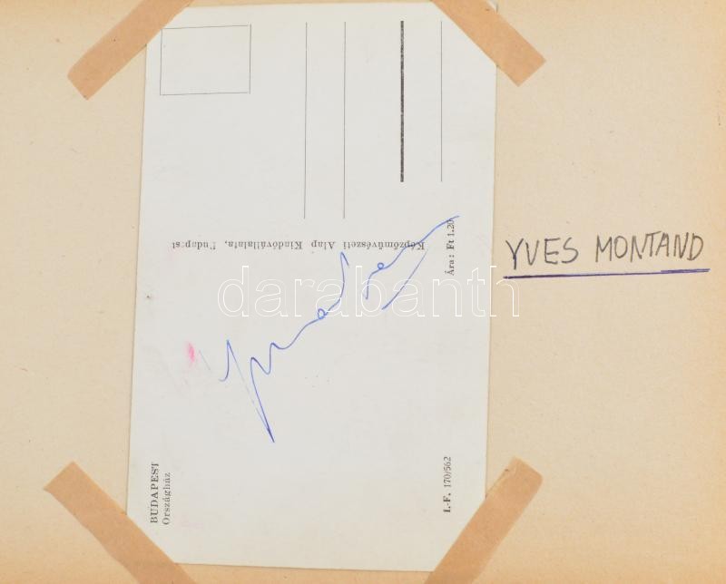 Leírás: Aláírás-gyűjtemény, színészek, énekesek sportolók aláírásai: Bodrogi Gyula, Törőcsik Mari, Házy Erzsébet, Darvas Iván, Yves Montand, Albert Flórián, Fenyves Máté, Gyurics György, stb.