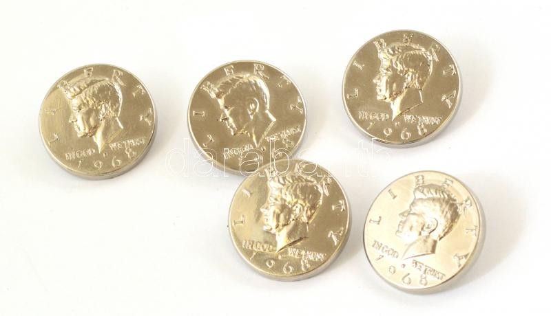 Leírás: 1968 John F. Kennedy arcképével díszített 5db fém gomb, d: 2,5 cm