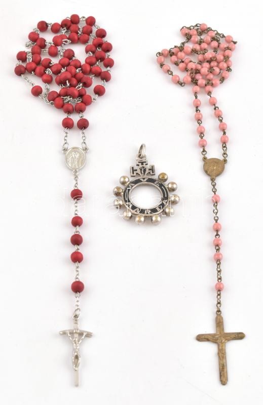 Leírás: 2 db rózsafüzér + medál, h: 43 cm, 50 cm, medál: 5x4 cm, dobozban