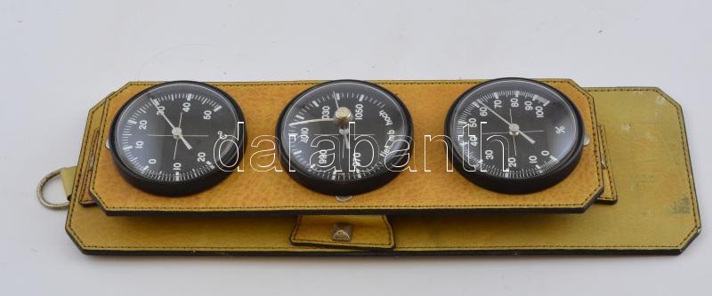 Leírás: Falra akasztható hőmérő, barométer, páratartalom mérő, bőr alapon, 34x11 cm