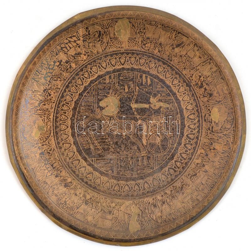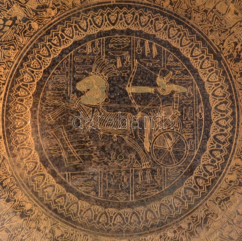 Leírás: Ókori-egyiptomi témával díszített réz falilemez, d: 19 cm