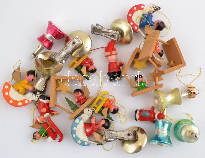 Régi karácsonyfa díszek, nagyrészt fa, de van közte 4 db régi "csipesz gyertyatartó" és 4 db festett üvegdísz is, összesen, 20 cm, különféle méretben, változó állapotban.