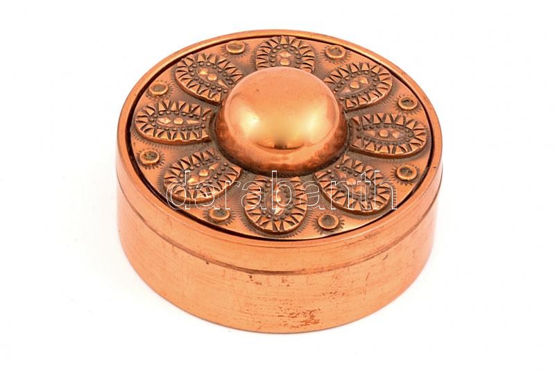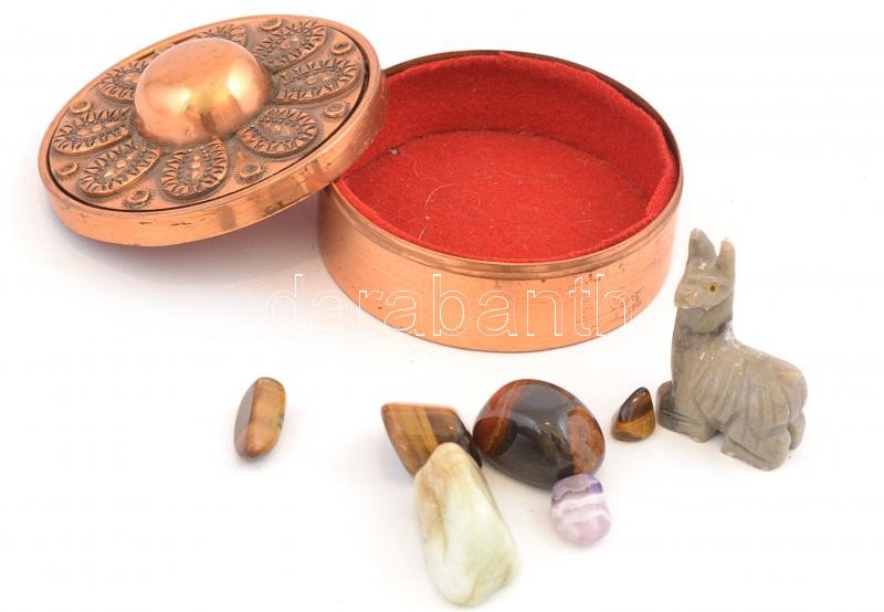 Réz ékszerdobozka, belül piros szövet borítással, benne különféle ásványokkal (6 db) és egy ásvány lámafigurával, rajta lepattanásokkal, d: 9 cm, m: 5 cm.
