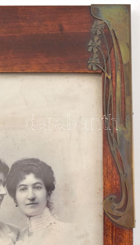 Leírás: Szecessziós, réz rátétes fa keret régi fotóval 17x30 cm