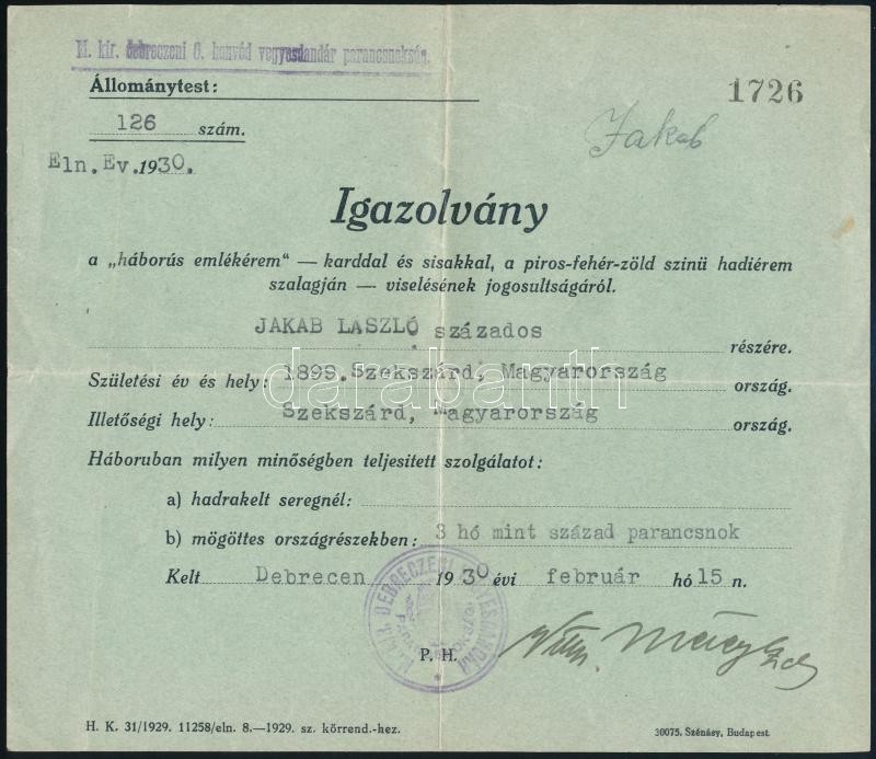 1930 A II. királyi debreceni 6. honvéd vegyesdandár parancsnoksága által kiadott igazolvány háborús emlékérem viselésének jogosultságára, hátoldalon Országos Vitézi Szék pecséttel