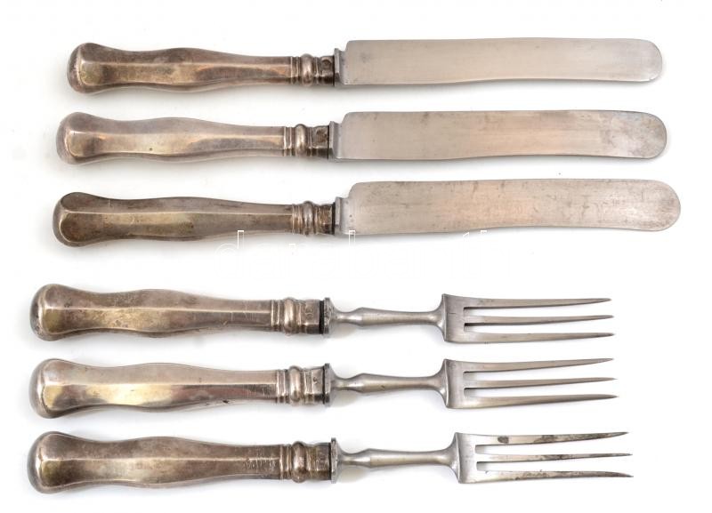 Leírás: Ezüst(Ag) nyelű kés és villa, 6 db (3+3), egyik kés pótolt, h: 23 és 26 cm