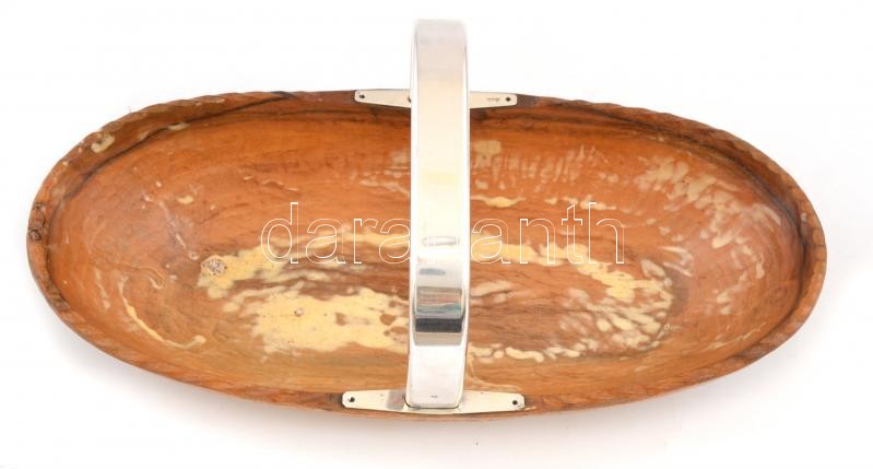 Leírás: cca 1930 Faragott, fa kínáló, ezüst (Ag.) fogóval, jelzett, 30x14 cmx12 cm, bruttó: 377 gr.