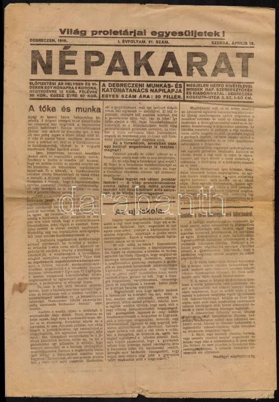 1919 Népakarat, a Debreceni Munkás- és Katonatanács napilapja, I. évfo... https://www.darabanth.com/hu/378-Gyorsarveres/378.0/Mutargy-papirregiseg-egyeb/Nyomtatvanyok~500031/1919-Nepakarat-a-Debreceni-Munkas-es-Katonatanacs-napilapja-I-evfolyam-21-szam-benne-a-~II1572224