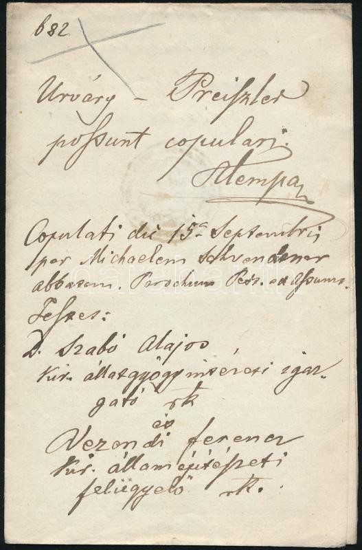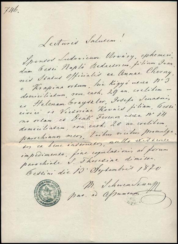 Leírás: 1870 A Terézvárosi plébános igazolása Ujváry Lajos, a Pesti Napló szerkesztőjének és Cherny Anna házasságáról