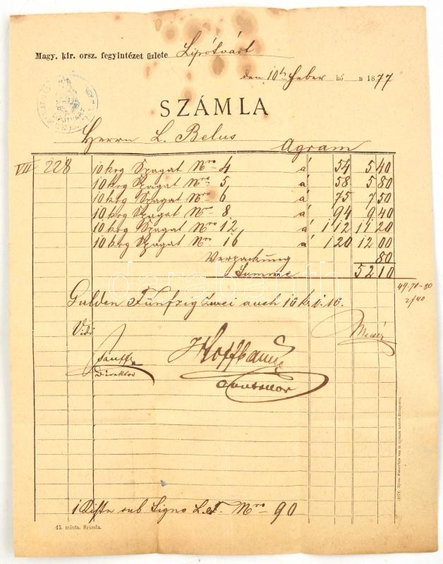1877 Magy. kir. orsz. fegyintézet üzlete Lipótvárt, számla Agramba (Zágrábba), magyar nyelvű fejléces papíron, német nyelvű írással, bélyegzővel, hajtásnyommal, kisebb lyukkal / Invoice of a prison in Leopoldov (Městěčko), now Slovakia, to Agram-Zagreb, with a small hole