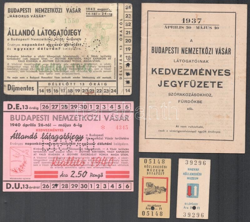 Leírás: 1937-1942 2 db belépőjegy a Közlekedési Múzeumba, 3 db a BNV-re, kedvezményes jegyzetfüzet