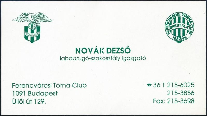 Leírás: cca 1994-1996 Novák Dezső FTC labdarúgó szakosztály igazgató, korábbi fradista labdarúgó névjegykártyája