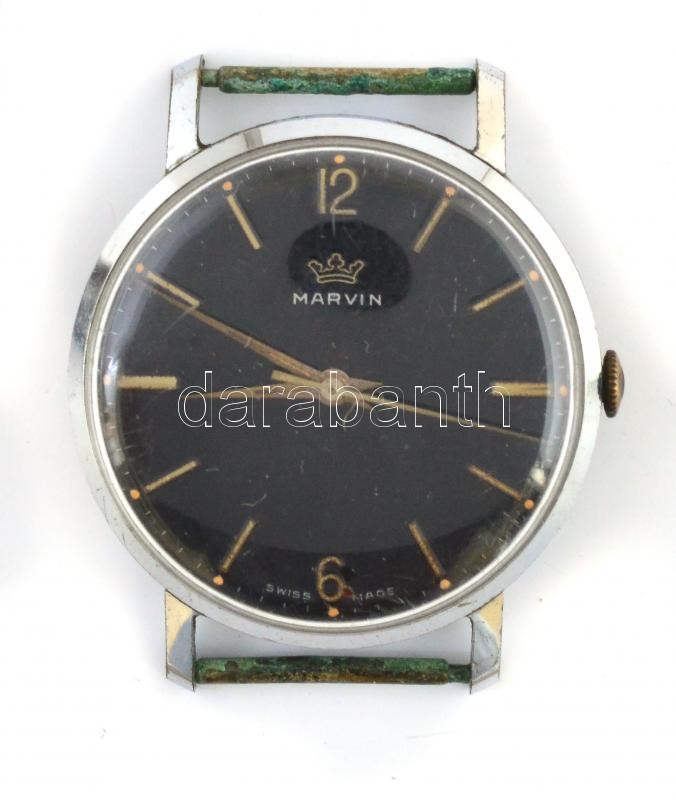 Leírás: Marvin karóra, fekete számlappal, hátoldalon kopásokkal, tisztításra szorul