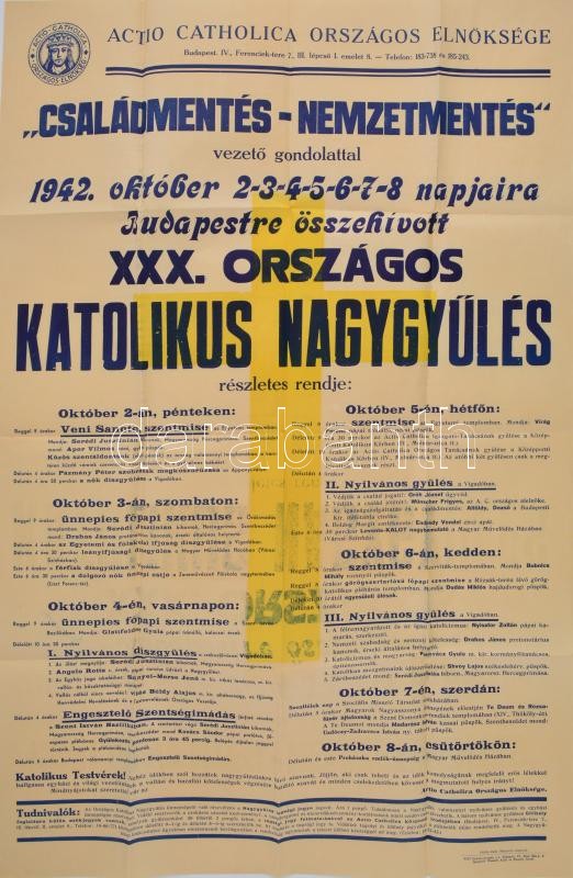 Leírás: 1942 A XXX. Országos Katolikus Nagygyűlés "Családmentés-Nemzetmentés" vezető gondolattal, plakát, hajtva, jó állapotban, 95×62 cm