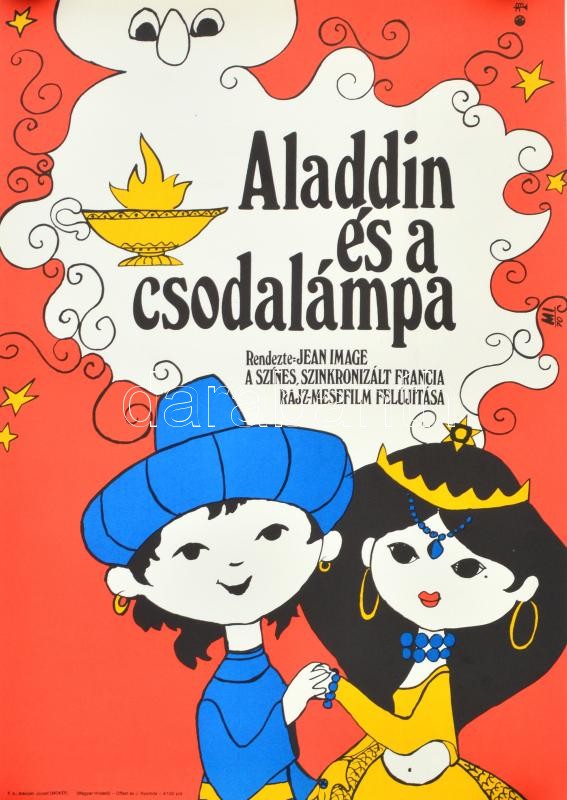 1970 Müller Ilona (1929-): Aladdin és a csodalámpa, francia rajz-mesefilm plakát, Bp., MOKÉP, MAHIR, Bp. Offset-ny., jelzett a nyomaton, feltekerve, 56x39 cm