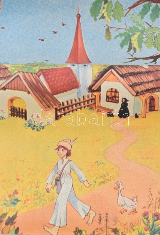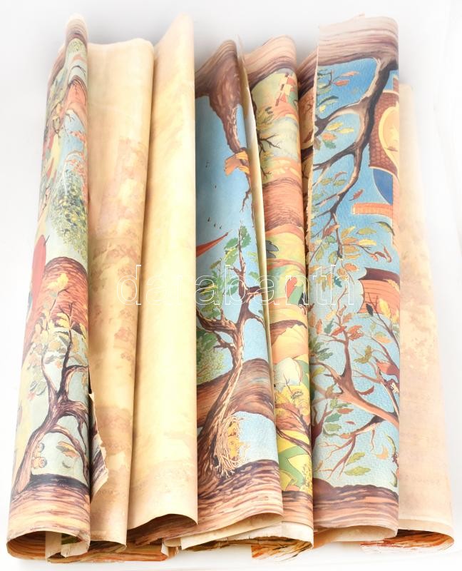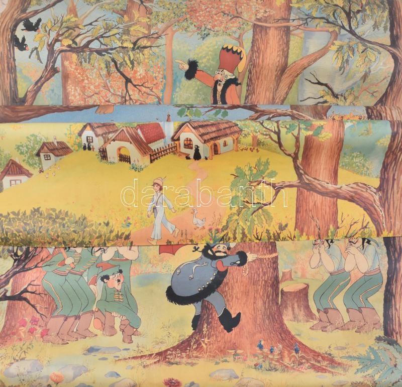 A Ludas Matyi rajzfilm, Dargay Attila illusztrációi után készült poszter szerű tapéta, használt, helyenként foltos, sérült és ragad, össz. 9 db, kb. 65,5x96,5 cm