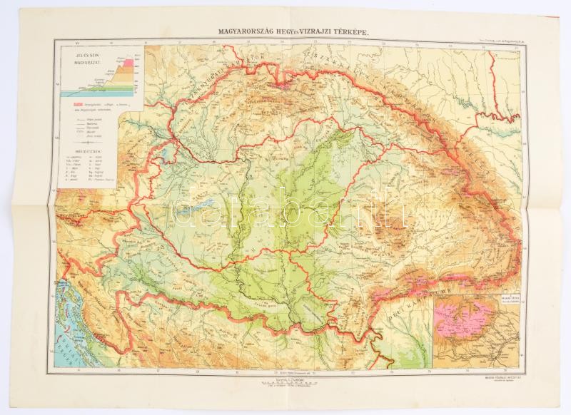 cca 1930 (Nagy)Magyarország hegy- és vízrajzi térképe, tervezte: Cholnoky Jenő és Kogutowicz Károly, kiadja: Magyar Földrajzi Intézet Rt., hajtott, jó állapotban, 35×47 cm