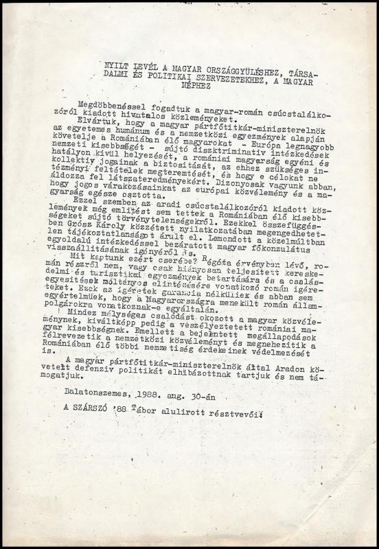 1987-1988 3 db dokumentum (A független sajtó munkatársainak nyilatkozatai a személyi változásokról és az Országgyűlés nyári ülésszakaszáról, Nyílt levél a Magyar Országgyűléshez, társadalmi és politikai szervezetekhez, a magyar néphez, Szárszó '88 záródokumentum)