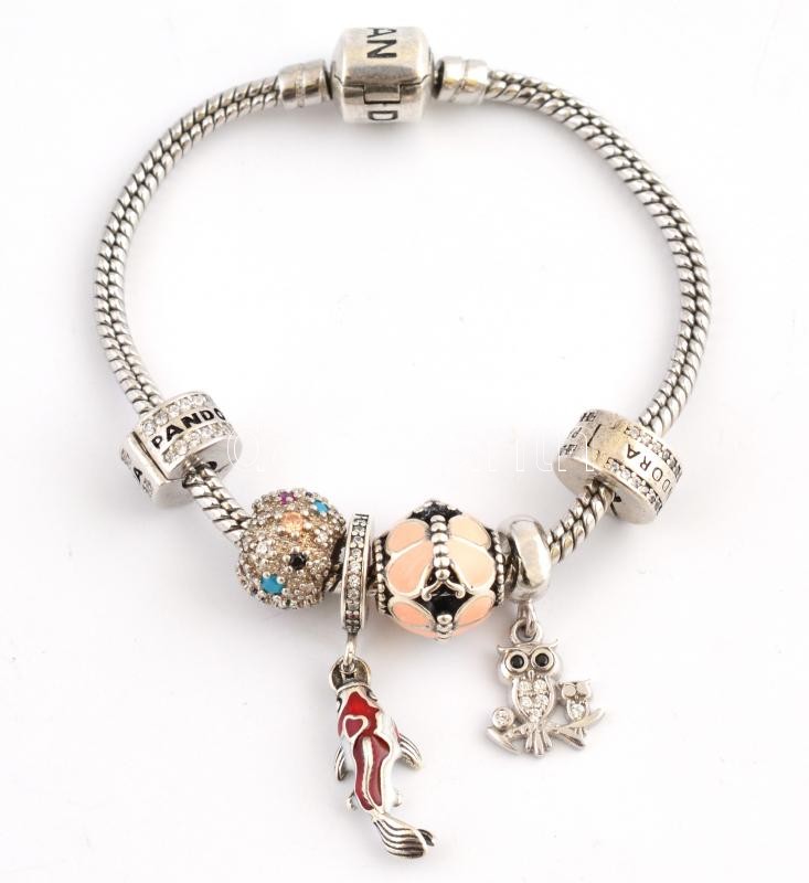 Leírás: Ezüst(Ag) karkötő, 6 db charmmal, Pandora jelzéssel, h: 15,5 cm, bruttó: 22,5 g