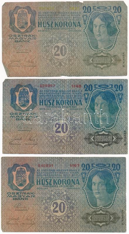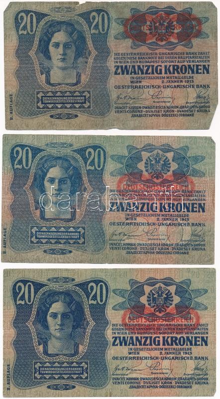 Leírás: 1913. 20K (3x) "DEUTSCHÖSTERREICH" felülbélyegzéssel, egyiken teljesen elmosódott sárga sorszámmal és sorozatszámmal T:III Adamo K18B