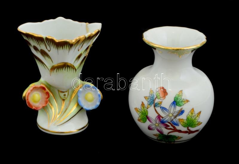 Leírás: 2 db kis méretű herendi Viktória mintás váza, kézzel festett, jelzett, egyik sérült és hiányos, m: 6,5 cm