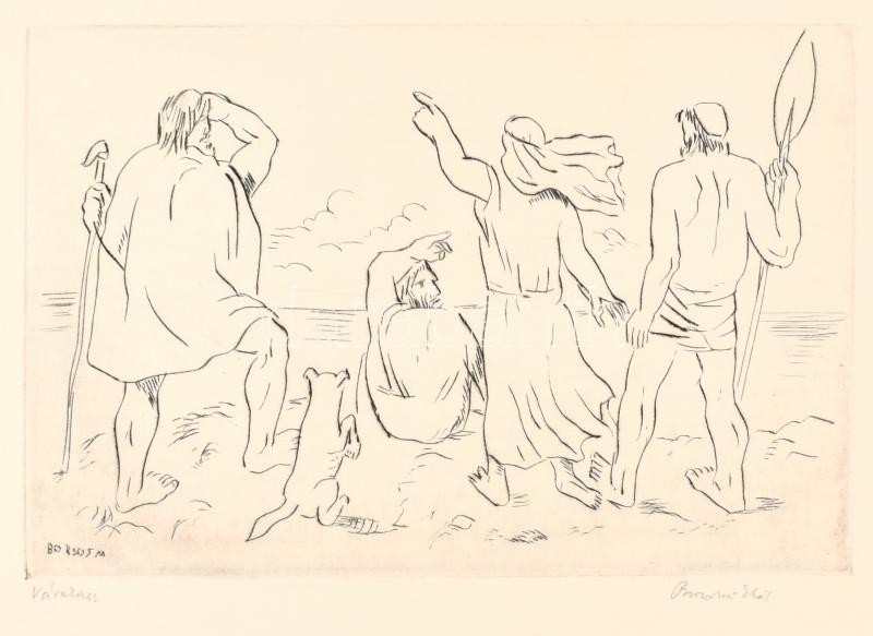 Leírás: Borsos Miklós (1906-1990): Várakozás. Rézkarc, papír, jelzett, 19,5×29 cm