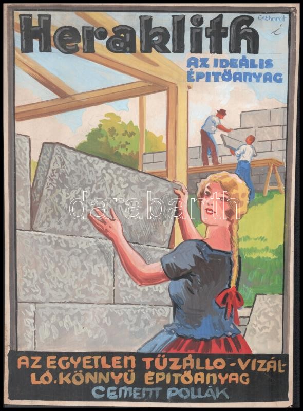 Gönczi-Gebhardt Tibor (1902-1994): Heraklith az ideális építőanyag, plakátterv, vegyes technika, papír, jelzett, hátoldalon a Globus Nyomda pecsétjével, 31×22 cm