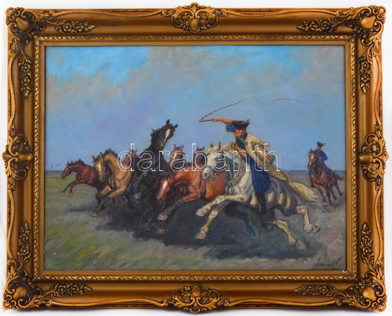 Leírás: Kolozsváry Kamilló (1936-2008): Csíkós vágtázó lovakkal. Olaj, vászon, kis felületi sérüléssel, jelzett, díszes fa keretben, 60×80 cm