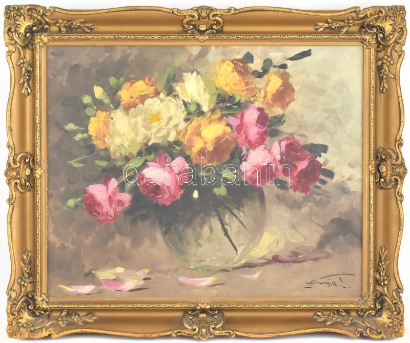 Leírás: Olvashatatlan jelzéssel. Rózsák. Olaj, vászon. Historizáló stílusú, kissé sérült fa keretben. 40×50 cm.