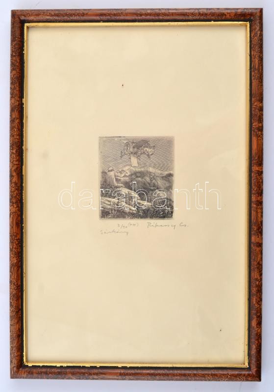 Leírás: Rékassy Csaba (1937-1989) - Sárkány. Rézmetszet, papír, jelzett, számozott (3/10). Üvegezett fa keretben, 6,5x5,5 cm