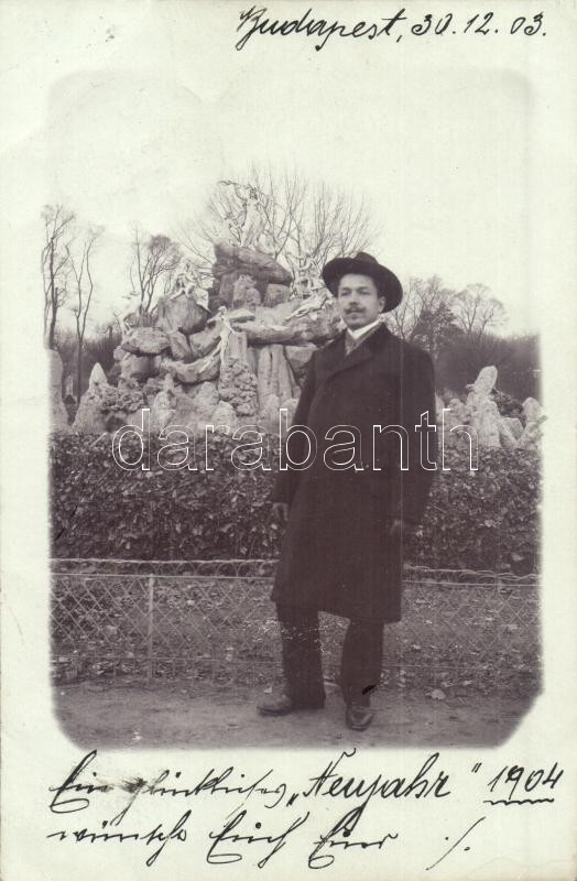 Leírás: 1903 Budapest XIV. Városliget, Sió tündér regéje szoborcsoport és szökőkút, úriember. photo