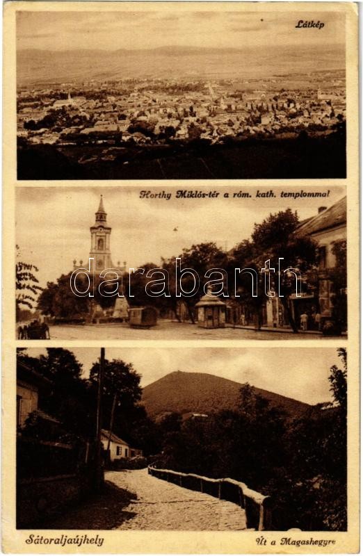 Leírás: 1936 Sátoraljaújhely, látkép, Horthy Miklós tér, római katolikus templom, üzlet, út a Magas-hegyre (EK)