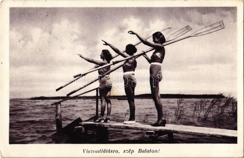 1937 Balaton, "Viszontlátásra, szép Balaton!" lányok magas s... https://www.darabanth.com/hu/379-Gyorsarveres/379.0/Kepeslapok/Magyarorszag~1500005/1937-Balaton-Viszontlatasra-szep-Balaton-lanyok-magas-sarku-cipokben-evezokkel-a-stegen~II2139444