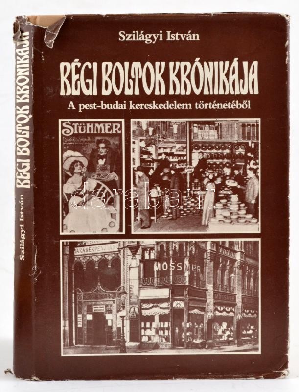Szilágyi István: Régi boltok krónikája. A pest-budai kereskedelem történetéből. Bp., 1986, Közgazdasági és Jogi Könyvkiadó. Kiadói egészvászon kötés, sérült papír védőborítóval, egyébként jó állapotban.