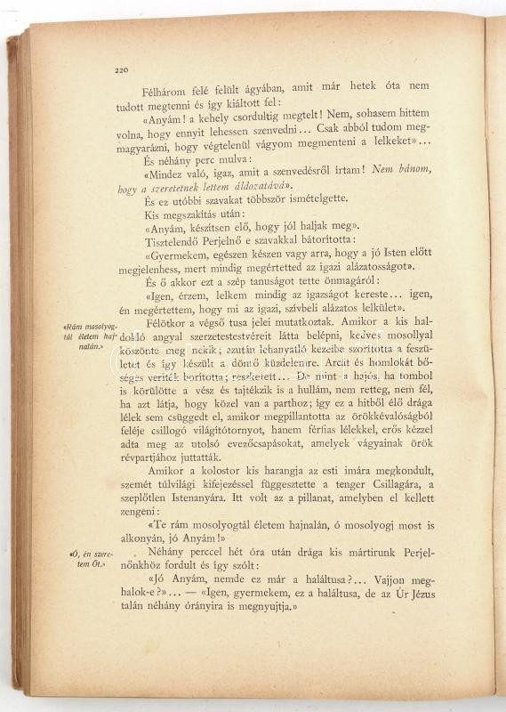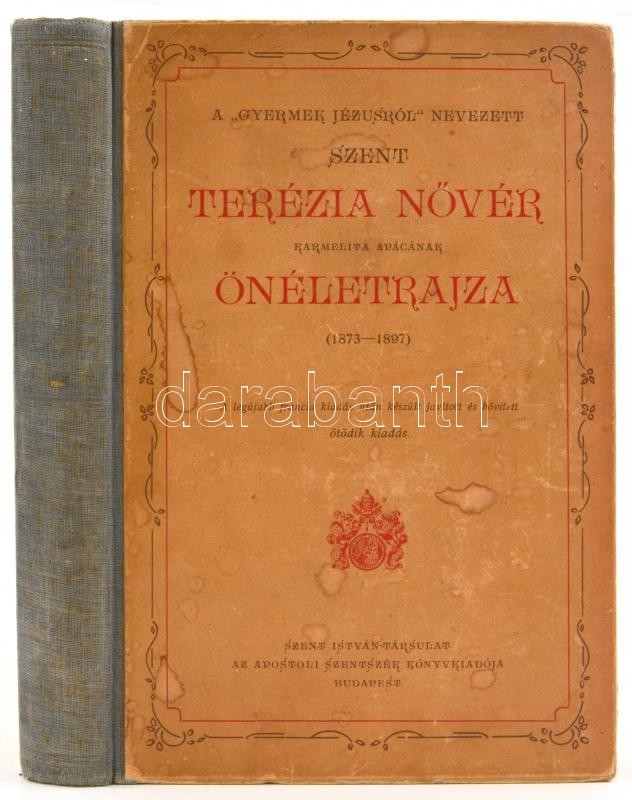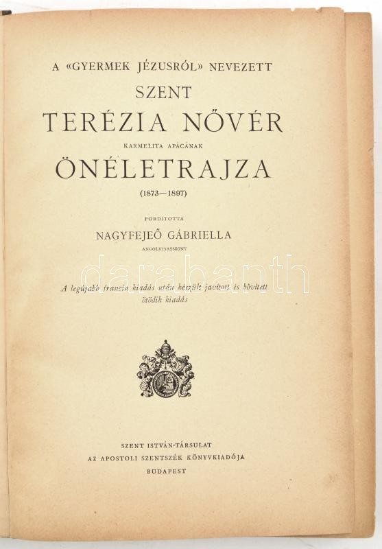 A 'gyermek Jézusról' nevezett Szent Terézia nővér karmelita apácának önéletrajza. (1873-1897.) Ford.: Nagyfejtő Gabriella. Bp.,1926,Szent István-Társulat. Ötödik kiadás. Egészoldalas illusztrációkkal. Kiadói illusztrált félvászon-kötés, kopott borítóval.