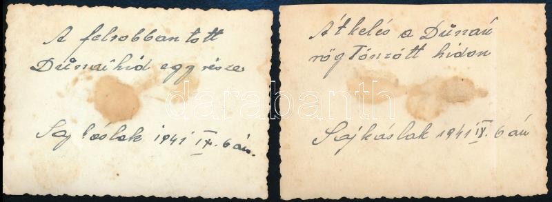 Leírás: 1941 Sajkáslak, A felrobbantott dunai híd egy része, átkelés a Dunán rögtönzött hídon, 2 db hátoldalon feliratozott fotó, 6,5×8,5 cm