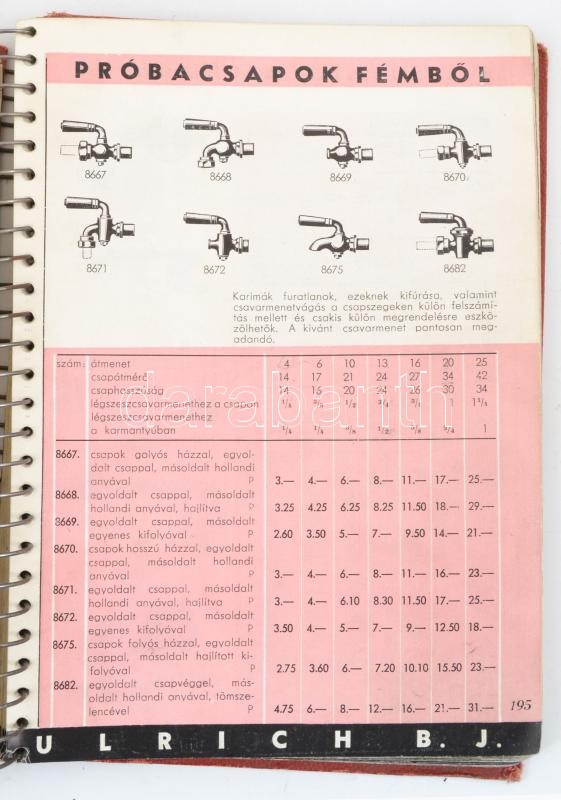 Leírás: 1940 Ulrich B. J. Katalógus Iparvállalatok Számára. Bp., Hungária Nyomda. Spirálozott vászon-kötésben,kissé kopott borítóval.
