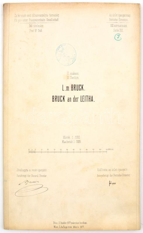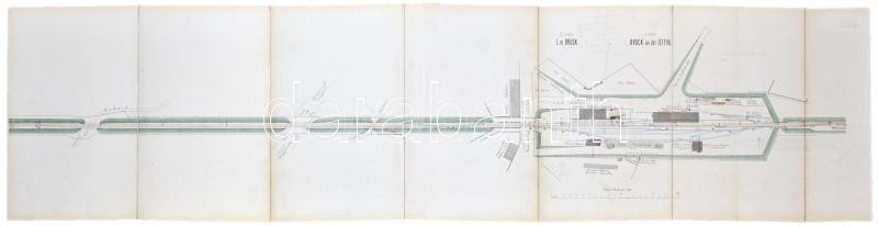 1877 Lajtabruck, Királyhida / Bruck and der Leitha osztrák-magyar határon áthaladó vasútvonal helyszínrajza a Királyhidai vasútállomás rajzával. Nagy méretű litográfia 136 cm x 35 cm / 1877 Kk. priv. österr Staaseisenbahn-Gesellschaft Austrian railways. Lithographic plan of the railways on the Austrian-Hungarian border at Lajtabruck, Királyhida / Bruck an der Leitha. with the railway station of Bruck an der Leitha. 136 cm x 35 cm