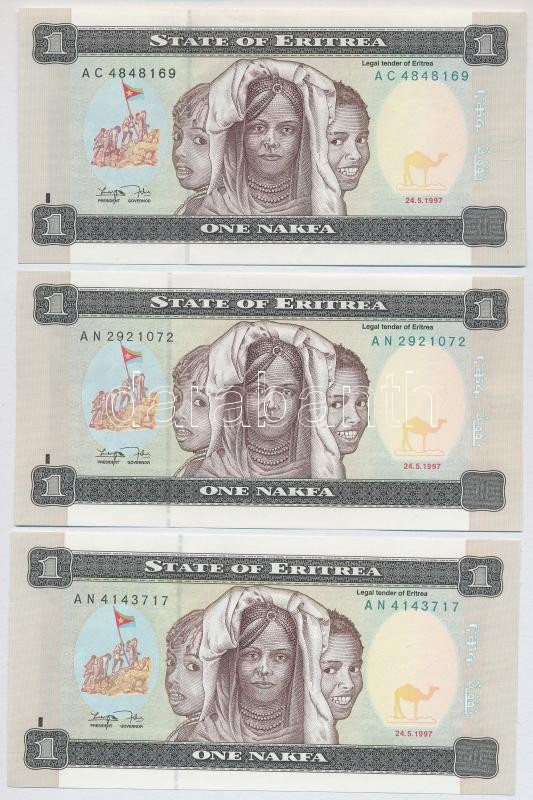 Eritrea 1997. 1 Nakfa (3x) C:Unc Krause 1 https://www.darabanth.com/hu/379-Gyorsarveres/379.0/Numizmatika/Kulfoldi-bankjegyek~2000013/Eritrea-1997-1N-3x-TI--Eritrea-1997-1-Nakfa-3x-CUnc-Krause-1~II2139467