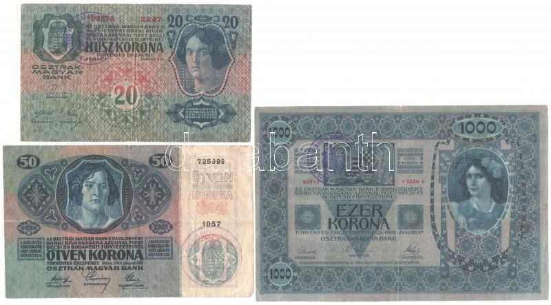 Leírás: 1902. 1000K hamis "Bács-Bodrog Vármegye Nemesmilitics Község 1904" felülbélyegzéssel + 1913. 20K hamis "Bács-Bodrog Vármegye Nemesmilitics Község 1904" felülbélyegzéssel + 1914. 50K hamis "Bács-Bodrog-megyei Ó-becsei Járás..." felülbélyegzéssel (all with fake overprint) T:III kis szakadások