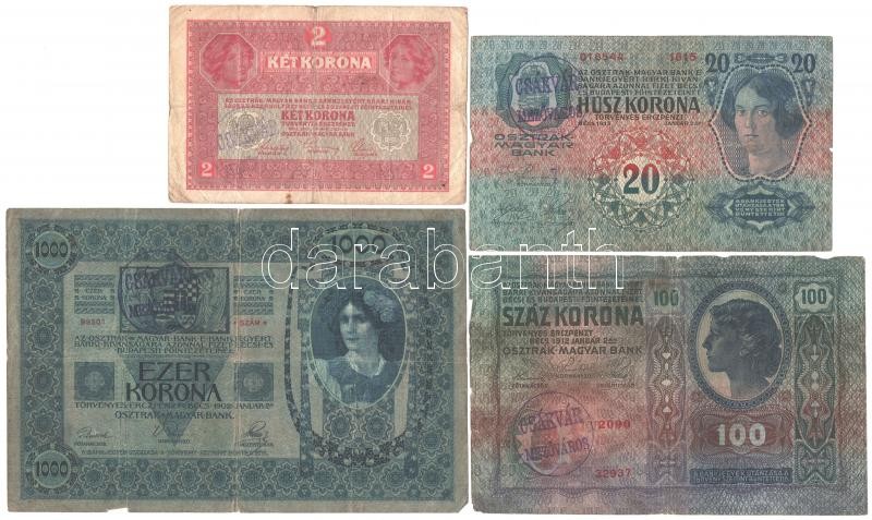 Leírás: 1902. 1000K + 1912. 100K + 1913. 20K + 1917. 2K, mindegyik hamis "Csákvár Mezőváros" felülbélyegzéssel (fake overprint) T:III