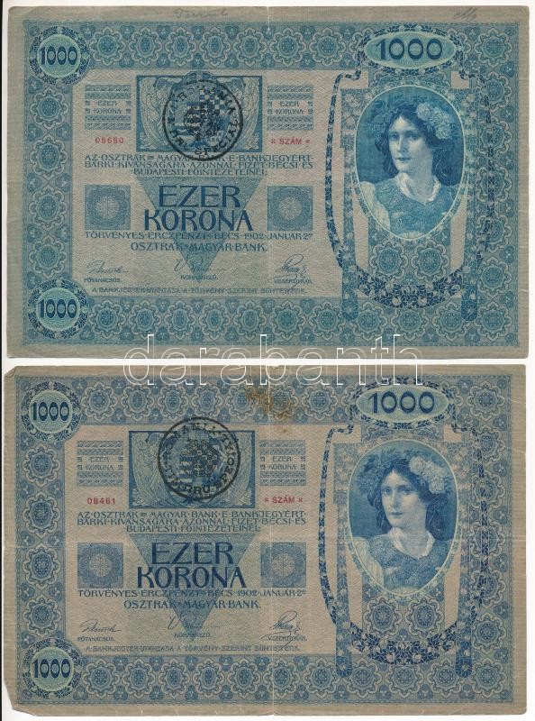 1902. 1000K román felülbélyegzéssel (2x) T:III,III- https://www.darabanth.com/hu/379-Gyorsarveres/379.0/Numizmatika/Magyar-bankjegyek~2000007/1902-1000K-roman-felulbelyegzessel-2x-TIII-III-~II2247631