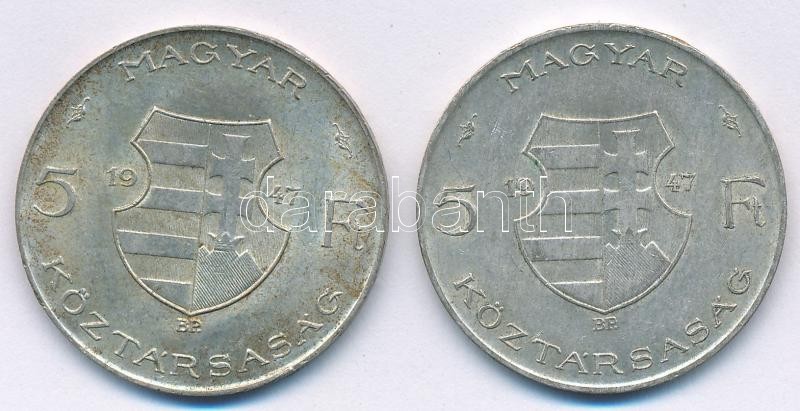 1947. 5Ft Ag "Kossuth" (2x) T:2,2- Adamo F8.1 https://www.darabanth.com/hu/379-Gyorsarveres/379.0/Numizmatika/Magyar-es-magyar-verdejelu-fem-es-ezustpenzek~2000008/1947-5Ft-Ag-Kossuth-2x-T2-2-Adamo-F81~II2169957