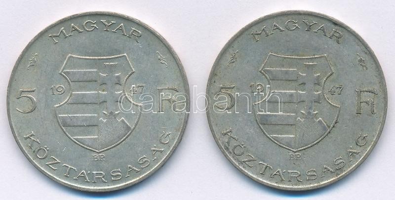 1947. 5Ft Ag "Kossuth" (2x) T:2- Adamo F8.1 https://www.darabanth.com/hu/379-Gyorsarveres/379.0/Numizmatika/Magyar-es-magyar-verdejelu-fem-es-ezustpenzek~2000008/1947-5Ft-Ag-Kossuth-2x-T2-Adamo-F81~II2170284