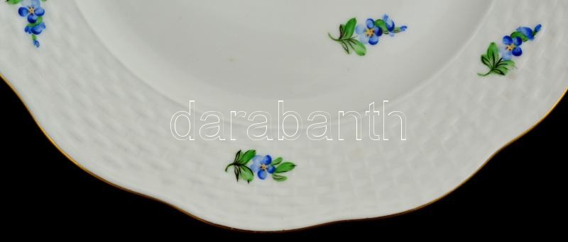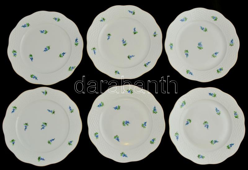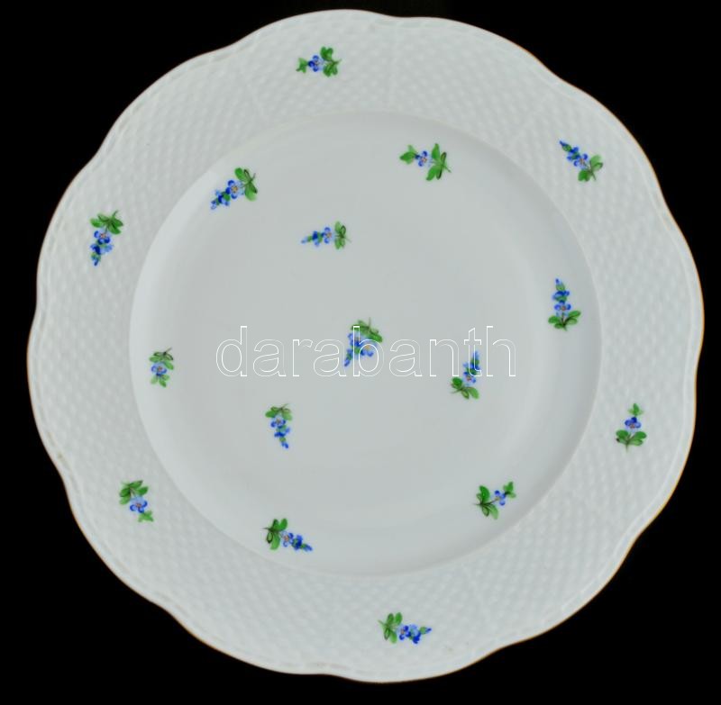 Leírás: Herendi virág mintás porcelán süteményes készlet. 6+1 darab Kézzel festett, jelzett, minimális kopással. d: 19 cm, 28 cm