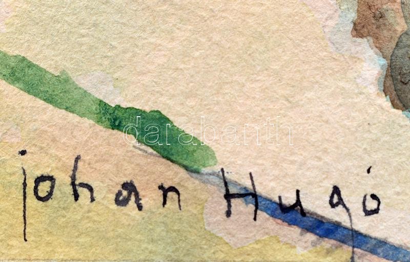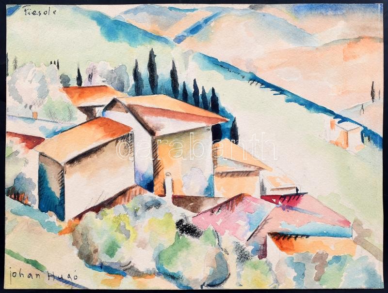 Johan Hugó (1891-1956): Fiesole, 1921 körül. Akvarell, ceruza, papír, jelzett. Proveniencia: Johan Hugó hagyatéka. 18x21 cm. 1911-ben gyógyszerészmesteri oklevelet szerzett, tanulmányai mellett rajzolt és festett. Két évig Kolozsvárott, majd 1918-ig Pécsett dolgozott gyógyszerészként. A tízes években több éven keresztül Dobrovics Péter mellett tanult festeni, kinek aktivista stílusa erősen hatott művészetére. Tagja volt a Pécsi Művészkörnek. 1921-ben Stefán Henrikkel és Molnár Farkassal itáliai tanulmányúton vett részt, feltehetően ekkor készült az avantgárd, főként a konstruktivista szemléletmódot tükröző és stílusjegyeit magában hordozó rajza. Johan Hugó korai művei ritkán kerülnek aukcióra, gyűjtői darab! / watercolour and pencil on paper, signed. Provenance: from the estate of the artist. Very rare early Hungarian avantgarde piece of art!